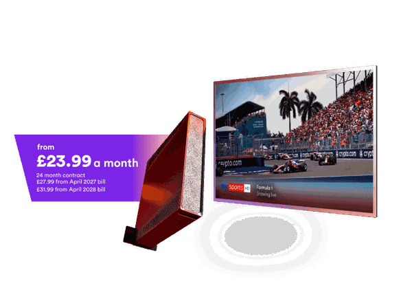 Sport Volt: New customers only. Mega TV, Sky Sports HD*, Gig1 Fibre Broadband (average download speed 1130Mbps). Currently £58.99* a month for 24 months. 24 month minimum term. Home Phone can be added from an extra £8 per month. Standard monthly pricing (currently £167* a month) applies from month 25. Discounted pricing may be offered in selected locations. Alternative broadband speeds available, prices vary depending on speed chosen. Inclusion of Netflix at no extra cost based on non-boosted broadband speed chosen. Downgrading a service in your bundle may result in loss of bundle discount or ineligibility to receive Netflix at no extra cost. If you cancel your service during your minimum term an early disconnection fee will apply. Includes O2 mobile SIM with unlimited minutes, texts and data. 5G available in selected areas. 5G device, sim and tariff required to access 5G. See o2.co.uk/coveragechecker for coverage. Europe Zone roaming capped at 25GB per month, chargeable at £3.50 per GB afterwards. Premium add-ons are available at extra monthly cost. If you cancel your service during your minimum term an early disconnection fee may apply. Downgrading a service in your bundle may result in loss of bundle discount. If you upgrade any aspect of the service, standard pricing will apply to that upgrade. Virgin Media reserves the right to withdraw or amend the pricing if you change any part of your package. Virgin Media reserves the right to withdraw this offer at any time. Offer may not be used in conjunction with any other offer unless stated by Virgin Media.