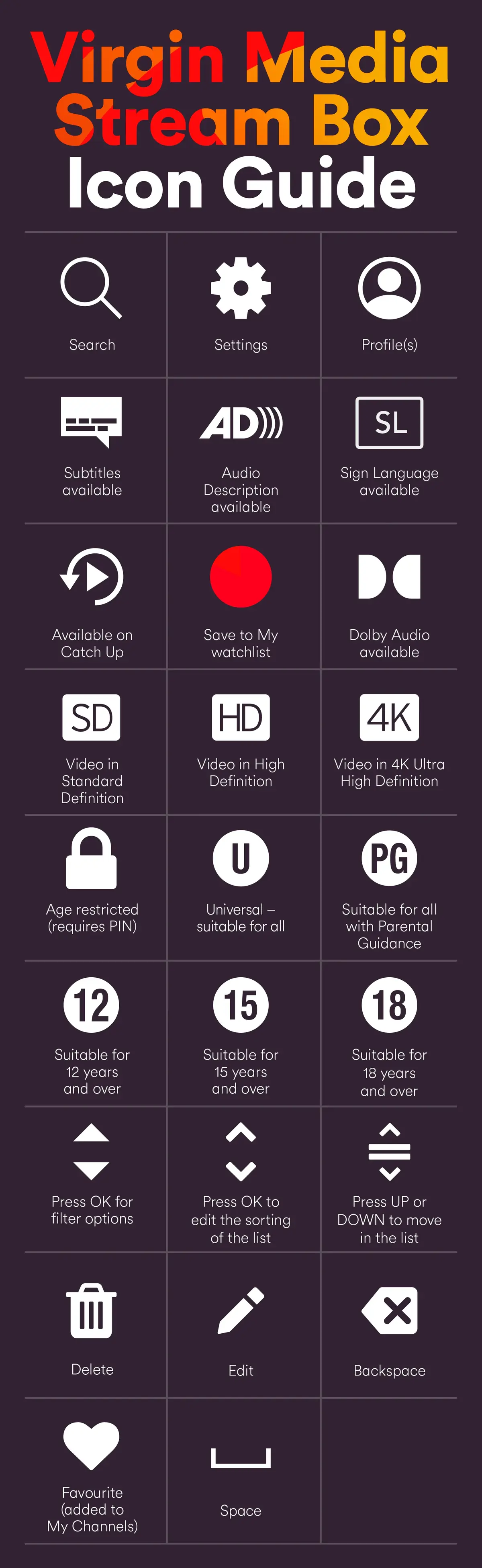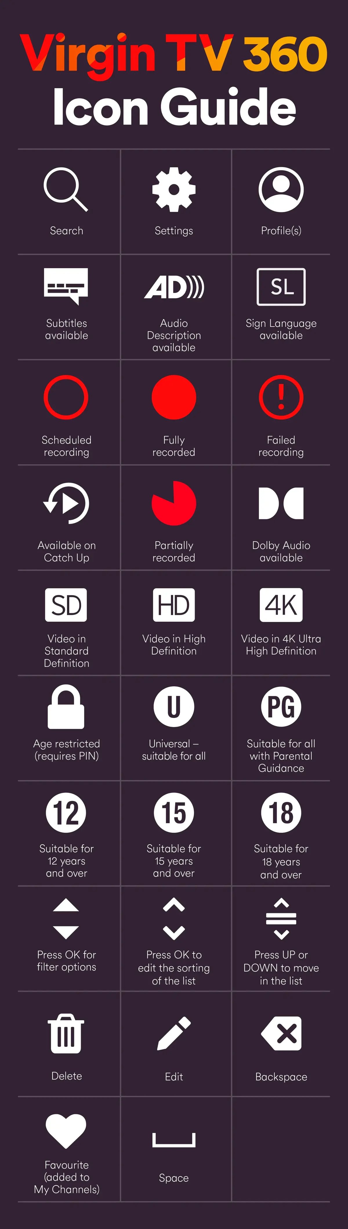 These little icons are there to help make your Virgin TV viewing even better. From info about whether a programme is available on catch up to the progress of your recording, it’s good to be in the know. Learn about each symbol with our handy Icon Guide, then head to the bottom to download the mobile version.